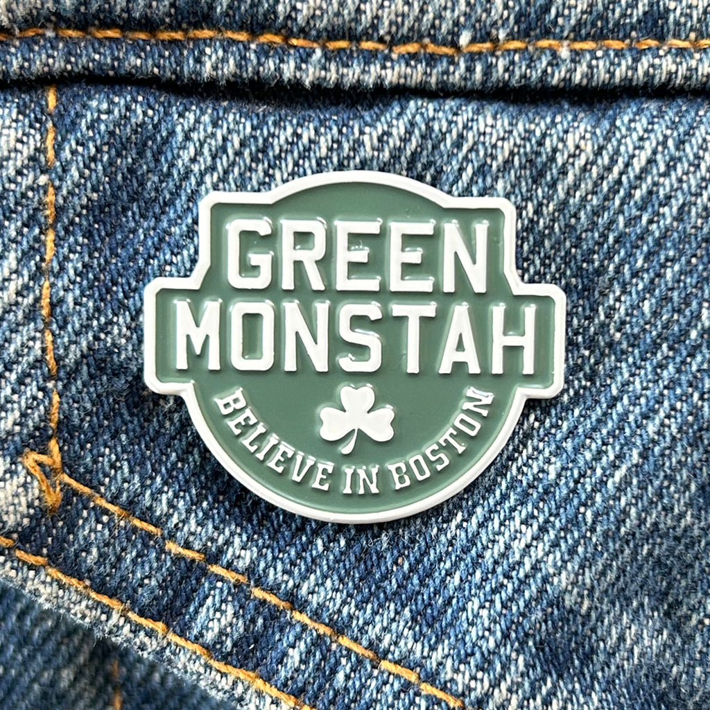 1.25" wide x 1" tall Green Monstah "Believe In Boston" enamel pin with a single post and rubber backing.