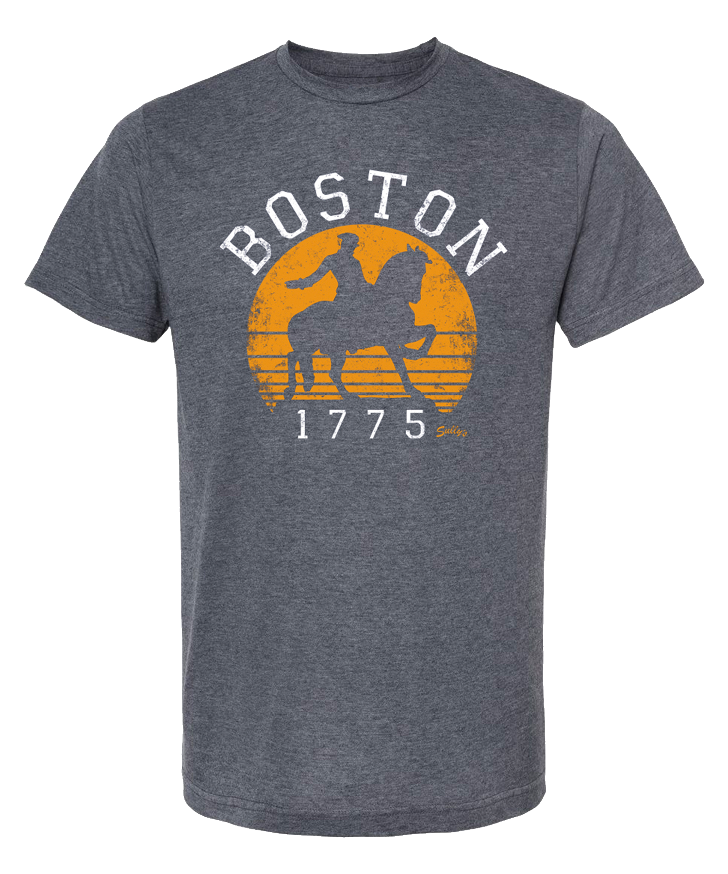 The Paul Revere statue in Boston's North End got the Sully's vintage treatment with this slightly distressed heather navy blue poly/cotton blended tee, screen printed with one pass of white and athletic gold ink.