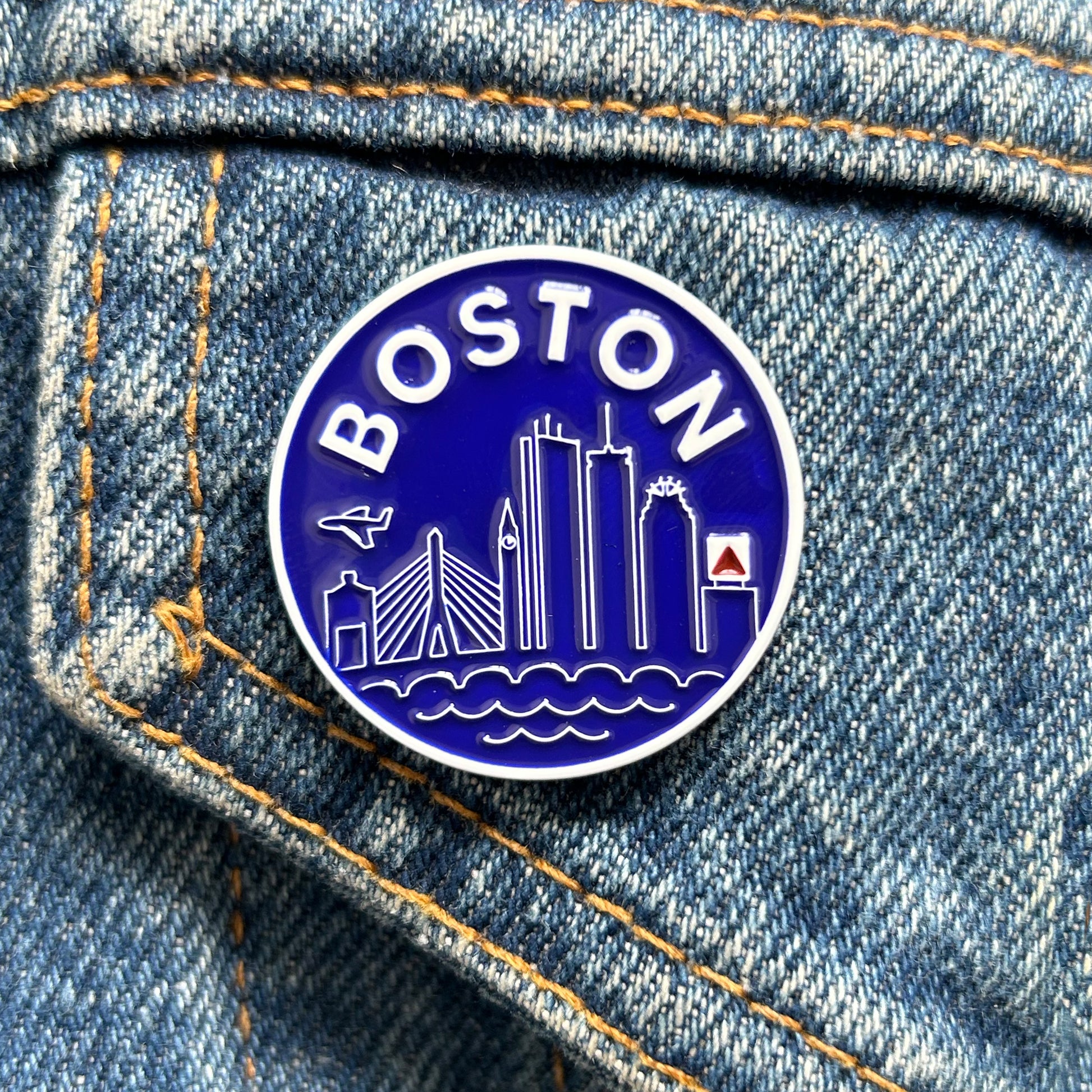 1.25" diameter Boston "Skyline" hard enamel pin with a single post and rubber backing. Also available as an iron-on patch, HERE!