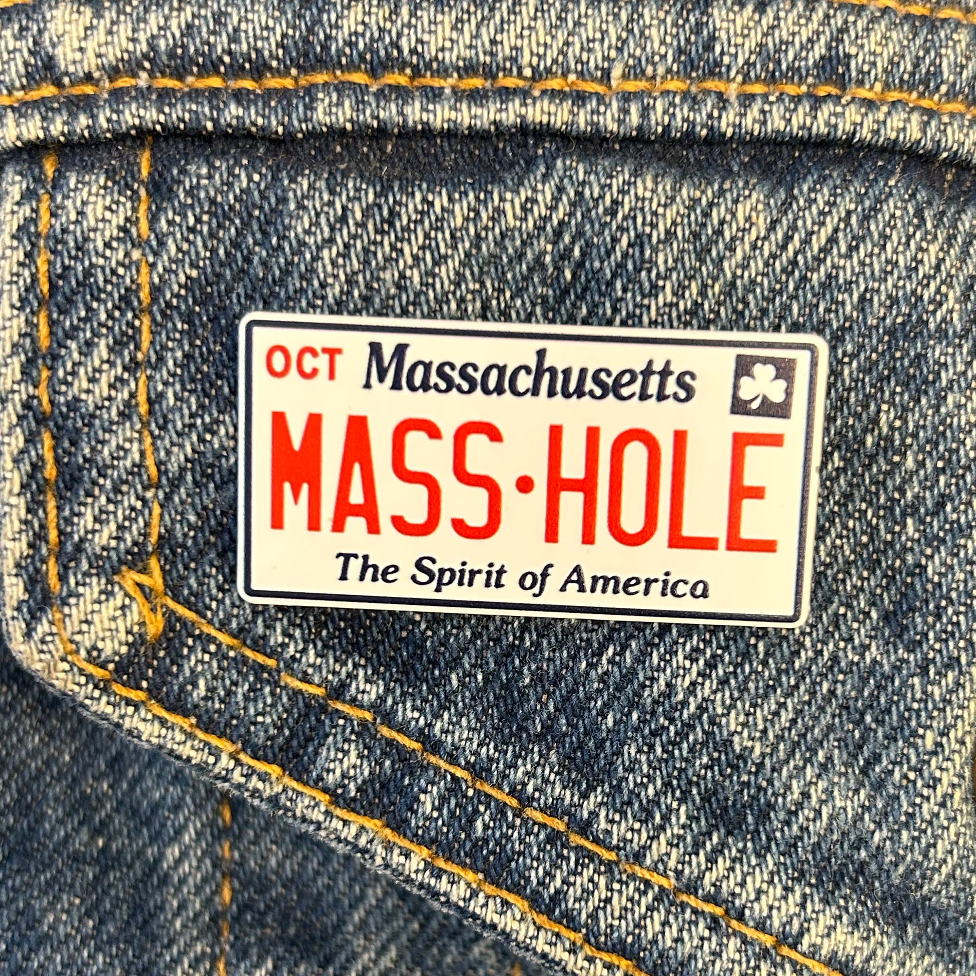 1.5" wide MASSHOLE "License Plate" soft enamel pin with a double post and rubber backings.